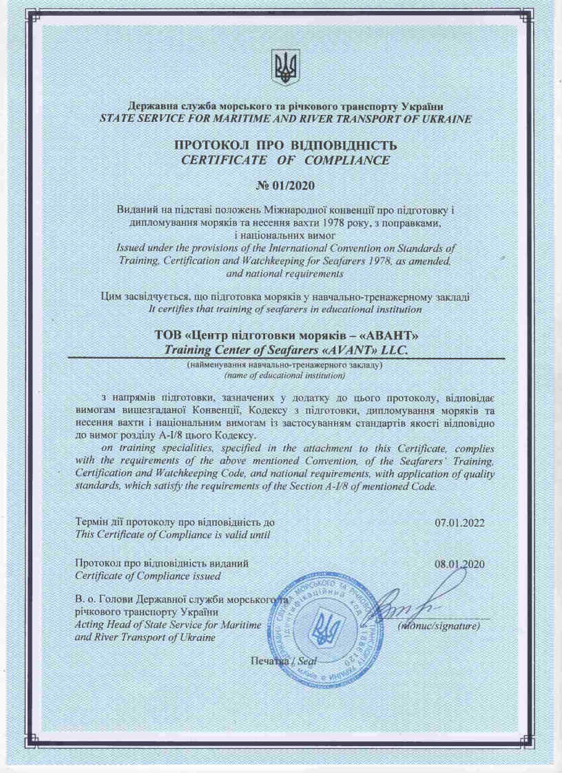 Протокол про відповідність вимогам Конвенції ПДНВ, видані Державною службою морського та річкового транспорту України