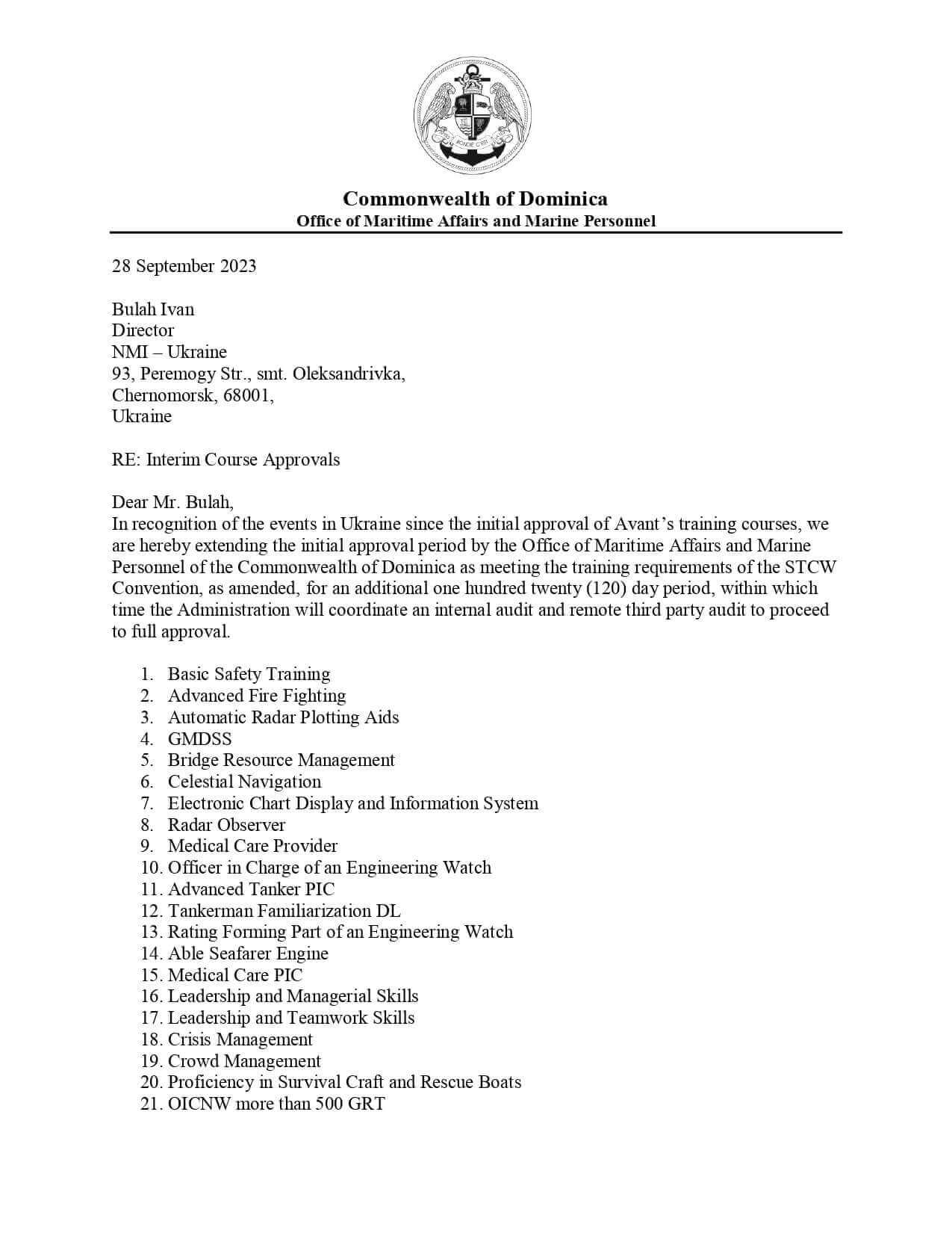 TCS AVANT - Interim Approval Letter Extension 0923, Commonwealth of Dominica, 2023
